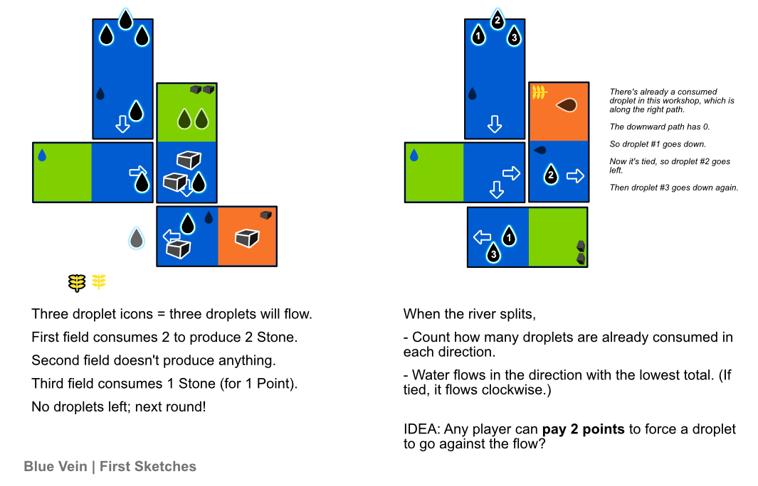 Finally, you can also throw your claim token onto the river whenever a droplet passes a field/workshop of yours.