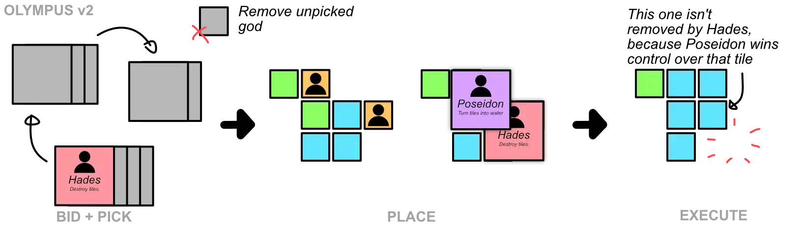 - Could be a bag-building game. You build a bag with tokens of gods. Whatever you get in a round is all you can enter when bidding for god powers.