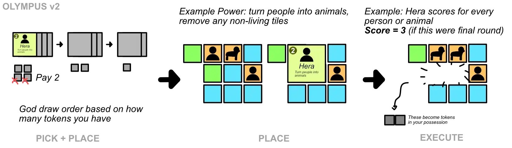 Each God has a fixed cost for using them (as this also allows balancing their powers further). If you can’t pay any God when it’s your turn to pick one, you choose none of them and get 3 random tokens.