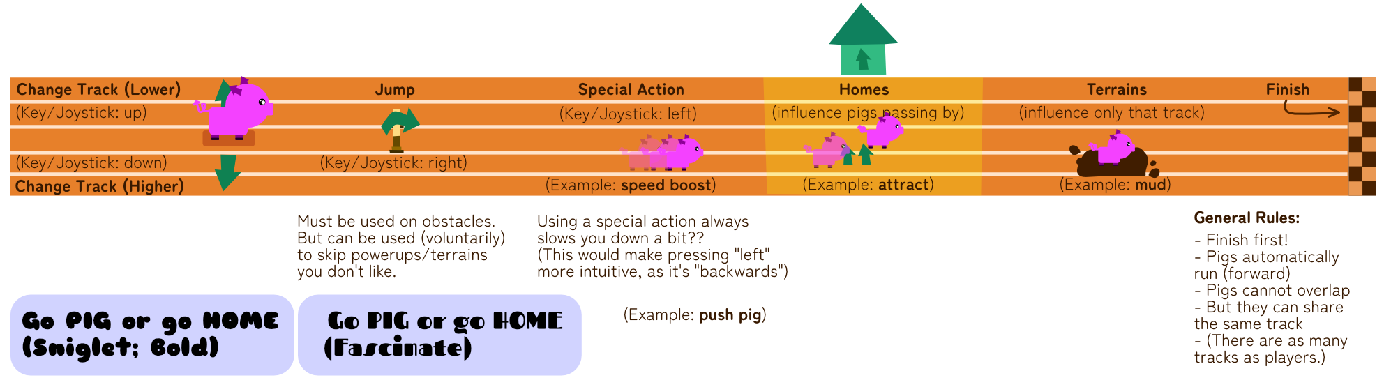 - Go Pig or Go Home => basic mode, just a simple race (very short rounds), every time someone is eliminated. Or, they are actual homes that pop up, and running into them (by accident) means you’re out of the race?