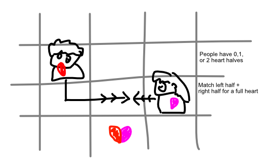 When you enter a square with someone else, your heart pieces are combined and given to both. (So need two matching halves, or someone with a full heart enters someone with no heart.)