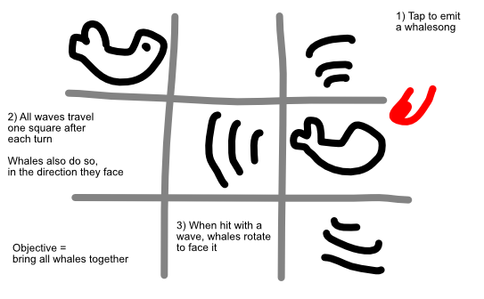 Each turn, the whalesongs ( = waves on water) travel one step further. When hit by a wave, whales rotate to face that way. Whales auto-move at the end of each turn (if possible).